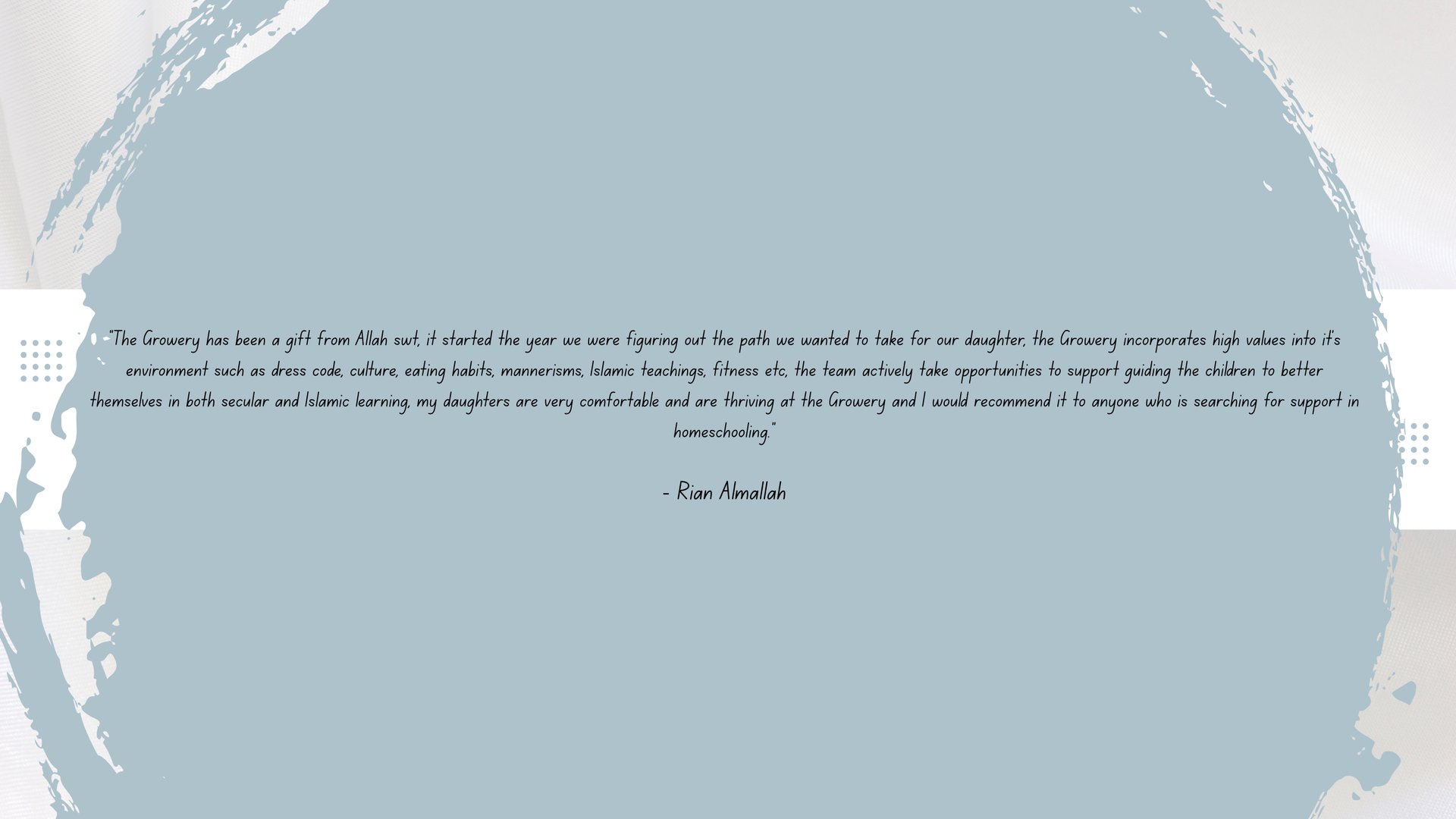 "The Growery has been a gift from Allah swt, it started the year we were figuring out the path we wanted to take for our daughter, the Growery incorporates high values into it’s environment such as dress code, culture, eating habits, mannerisms, Islamic teachings, fitness etc, the team actively take opportunities to support guiding the children to better themselves in both secular and Islamic learning, my daughters are very comfortable and are thriving at the Growery and I would recommend it to anyone who is searching for support in homeschooling."